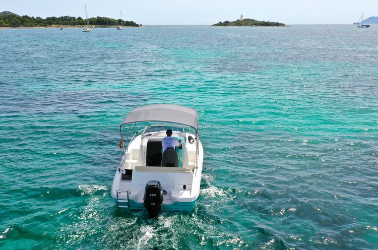The boat is powered by a 115 HP outboard engine and requires a valid license to operate. It is designed for simple and efficient cruising, making it suitable for self-drive charters.