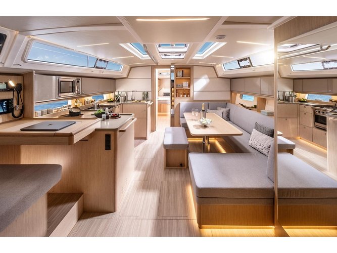 This is a 45.8 feet long sailboat rental that provides the guests with 4 cabins with 9 sleeps and 4 bathrooms. There are 10 extra services available for you to customize your trip on this sailboat charter. The mandatory extras payable now are already included in the rental price. By clicking the reservation button, you will be able to choose from the optional extras to further customize your sailing vacation.