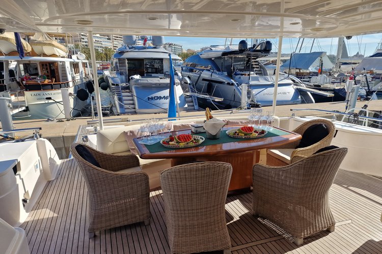 Outside on the fly bridge, this beautiful yacht has a Jacuzzi and an electric barbecue. It has a jet tender for those all-important visits to the beach and includes water skis, wakeboards, doughnuts, donuts and snorkelling equipment. On the front deck, you will find a full-width sunbathing area with custom-made cushions, where you can relax in style and comfort. On the rear deck, you will find an 8-seat dining table, the place to see and be seen (under cover), together withan additional sunbathing area with access to the bathing platform and dive ladder. From this point, you can board the jet tender and visit the beaches, coves and restaurants or simply enjoy a myriad of water sports. There is also a fully equipped kitchen and utility/laundry room on board where the crew can take care of any domestic requirements that you may have.