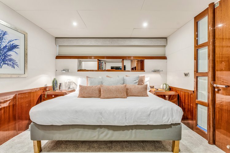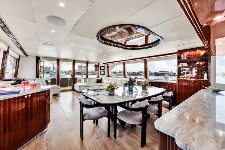 Designed for both relaxation and entertaining, this yacht features expansive living spaces, sleek lines, and a layout that feels spacious and inviting from bow to stern. Guests can enjoy beautifully updated interior areas, generous exterior deck space, and premium amenities that make every charter feel effortless and luxurious. Whether you are cruising through Miami, anchoring with friends, or celebrating a special occasion, the 94’ Lazzara delivers a refined and memorable day on the water.
