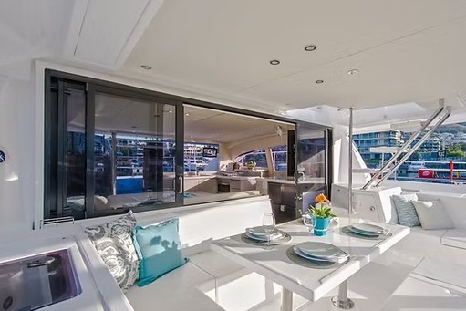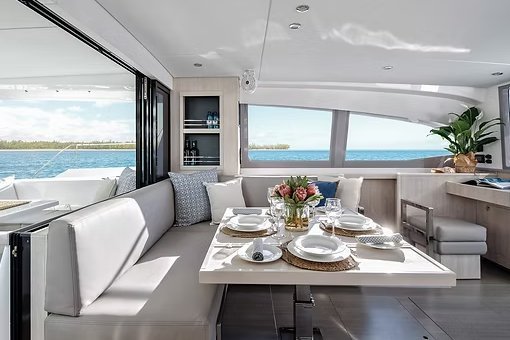 Enjoy four distinct spaces designed for every mood: a cozy interior lounge, a shaded aft deck for laid-back seating, a flybridge with shade and panoramic 360° views, and a foredeck featuring beanbags and a sun pad for soaking up the sun.