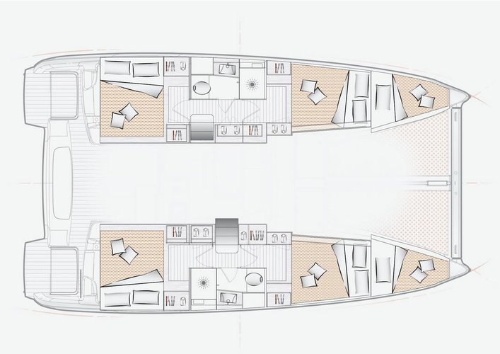 This charter has 6 cabins with 10 sleeps and 2 bathrooms. There are 58 extra services available for you to customize your trip on this sailboat charter. The mandatory extras payable now are already included in the rental price. By clicking the reservation button, you will be able to choose from the optional extras to further customize your sailing vacation.