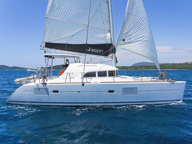 Get behind the helm of this gorgeous Kavala sailboat rental, a Lagoon 380 from 2011, ideal for a group of friends or family vacation in Greece. We recommend this comfortable Catamaran charter with max capacity of 10 guests, perfectly suitable for a week of fun with a group of friends or for a family nautical adventure.