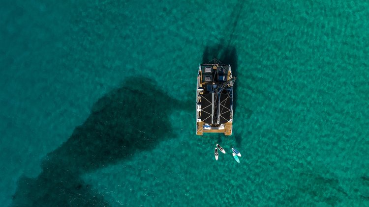 We have taken care of even the smallest detail in its construction. It has private spaces with tables and seats, a beautiful teak deck, double BBQ to simultaneously prepare meat and fish, swim ladders at the bow and stern. Its custom-made black sails give it the great final detail.