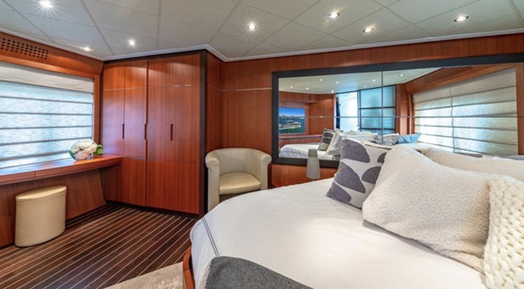 Equipped with modern amenities such as a premium sound system, plasma TV, and water toys including a tender and waterskis, the yacht ensures both relaxation and adventure. Guests can enjoy a range of water sports, making it perfect for those seeking an active day on the water.