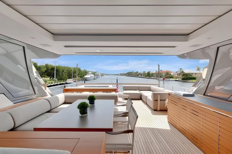 Outdoor living spaces are designed for maximum enjoyment. Guests can relax on expansive sun pads, enjoy alfresco dining in the shaded aft deck, or unwind on the spacious flybridge while cruising past iconic Miami destinations such as Star Island, Fisher Island, and Key Biscayne.