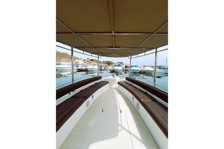 Powered by twin Honda BF250 engines, the boat offers a safe and stable ride with experienced crew onboard. Guests can relax in the shaded deck area or inside the comfortable cuddy cabin, with music available via Bluetooth sound system.