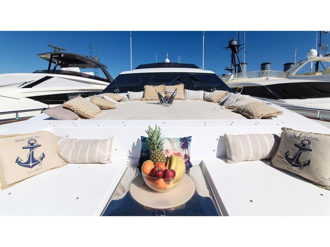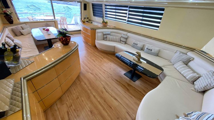 Driving this lovely 83.7’ motor boat rental from Mykonos, Greece is pure pleasure - we're sure you will thoroughly enjoy it! If you are looking to spend your time on the water with a group of up to 23 friends, this spacious 1999 yacht charter is a perfect option!