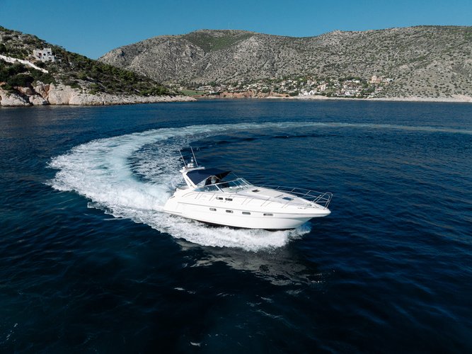 You will experience a great sail and create wonderful memories on this superb Sealine motor boat rental from Ornos, Greece! If you are looking for a week-long trip for a group of max 6 guests, this 1997 Sealine S37 yacht charter equipped with all the facilities you need on board is a great choice.