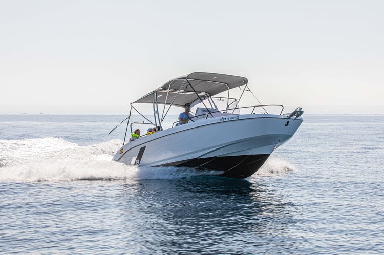 Discover the stunning coastline of Mallorca in unparalleled comfort and style with Boat Rental Palma. Our pristine 2023 Beneteau Flyer 8 Spacedeck center console, meticulously maintained and departing from the heart of Palma, offers a premium escape for up to eight guests.