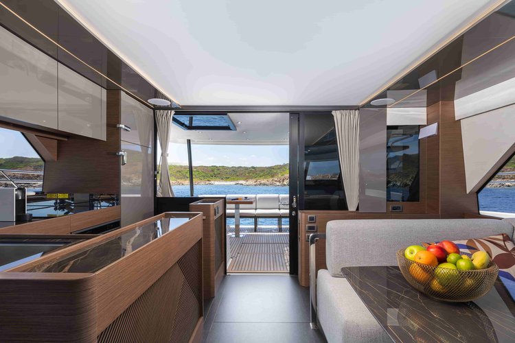 This motor boat rental from Portisco, Italy is perfect for a sailing adventure with your friends or a memorable family vacation. The 2025 Prestige M48 yacht charter is an excellent choice for a group of up to 6 guests that can spend a very comfortable week, enjoying all the facilities onboard.