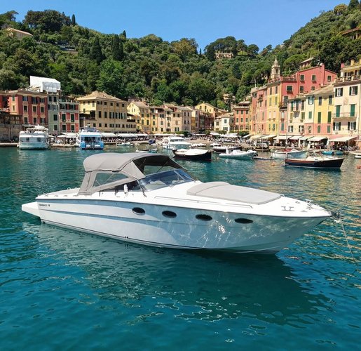 Ride the waves in total relaxation aboard our Tornado 38 . A true "Made in Italy" icon, it is renowned for its high performance, sporty flair, and one-of-a-kind design. The yacht accommodates up to 10 passengers and offers all the comforts of a high-end vessel.