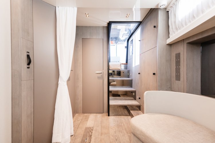Below deck you’ll find a stylish cabin with comfortable sleeping space and a full bathroom, perfect for relaxing during your charter. The yacht can accommodate **up to 12 guests during the day**, making it ideal for group celebrations or luxury day cruises.