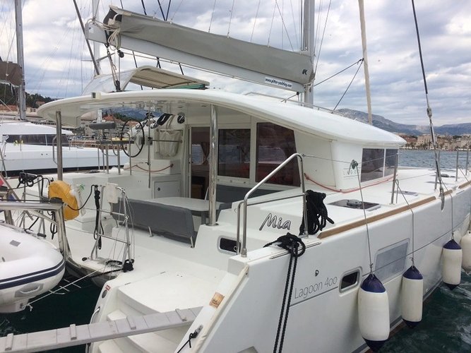 Take this stunning sailboat 39.3’ Lagoon boat rental in Valencia, Spain for a ride and enjoy sailing one of the best models made by this famous boat builder. The elegant Lagoon 400 Catamaran charter built in 2012 has all the onboard facilities to comfortably and safely accommodate up to 12 guests.